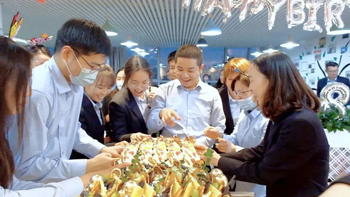 經(jīng)過精心裝扮后的生日會現(xiàn)場溫馨又別致。飄飄欲飛的氣球點綴的滿堂煥彩,五彩繽紛的禮物奪目吸睛,各色讓人食指大動的甜點將空氣也熏染出香甜,更有象征著祝福與慶賀的生日大蛋糕引起矚目,生日會在如此瑰麗美好的開局中拉開序幕。本次生日會由國內(nèi)市場部王經(jīng)理、國際市場部Maggie共同主持。