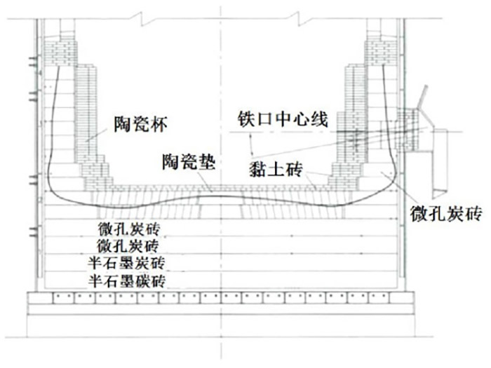 隨著高爐裝備技術的不斷發展,高爐使用銅冷卻壁后,高爐壽命的限制性環節逐漸從爐身下部、爐腰、爐腹等高熱負荷區域轉向爐缸,爐缸部位逐漸成為高爐性能的薄弱環節。高爐爐缸通常采用陶瓷杯+炭磚復合技術。為了延長爐缸壽命,提高耐火材料性能及合理配置是關鍵。高爐爐缸爐底長期遭受鐵水和熔渣的侵蝕,且長期存貯高溫鐵水,無法修補,因此對高爐陶瓷杯及爐底炭磚的性能提出了更高要求。