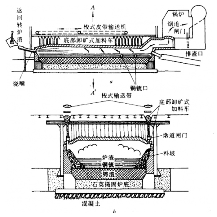 近年來,大型熔煉反射爐采用止推式吊掛爐頂、虹吸式放冰銅及鎂鐵整體燒結(jié)爐底;精煉反射爐采用打眼放銅;加料口及拱腳梁用水冷卻、加料系統(tǒng)自動(dòng)控制以及逐步推廣余熱鍋爐等。