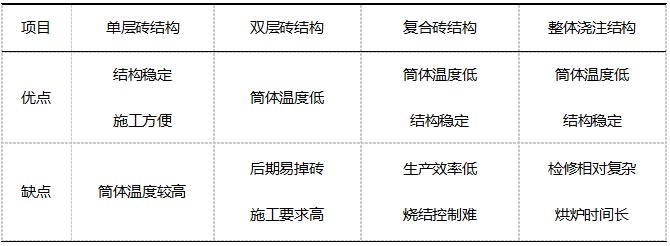 以上幾種設計方案優缺點如表1所示。相比較而言,耐火磚方案檢修和更換方便,受環境和人為因素影響較小。現在新建項目回轉窯基本都是室外設計,隨著提產和環保要求,采用單層結構穩定性較好,高溫區可以考慮凹槽復合磚方式,降低外壁溫度。而且從防腐蝕角度,筒體外壁溫度控制在160-320℃區間,比較合理。