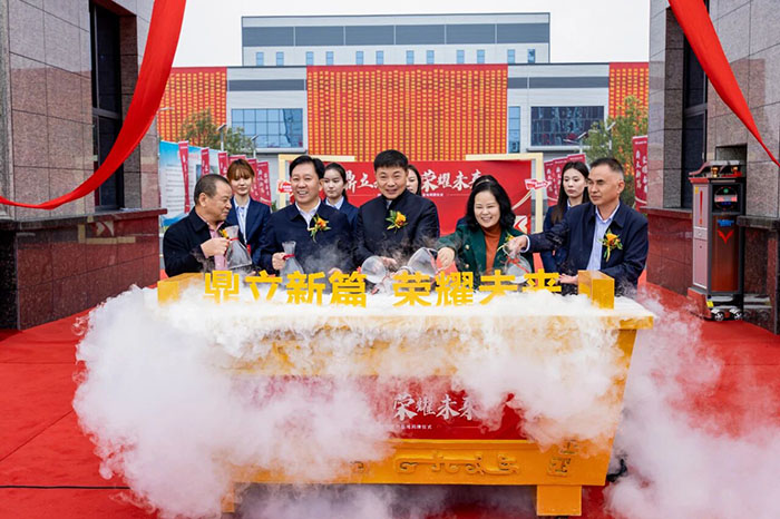 祥瑞盈門,宏圖待展。在激動人心的主題啟動環節,孫琪、張新亮、孟彩虹、楚科奇、白建偉等五位領導共同登臺。隨著全場齊聲倒數“五、四、三、二、一!”,他們一同將象征著光榮與夢想的甘露注入啟動臺。瞬間,霧氣奔涌,“鼎立新篇,榮耀未來”八個大字磅礴升起,氣貫長虹!寓意著河南榮盛科技集團一個全新的時代正式開啟,未來必將大氣磅礴,景象萬千!