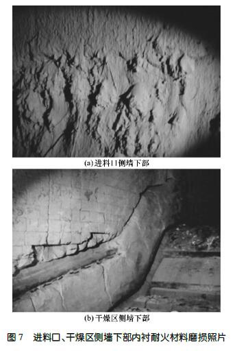 焚燒爐進料口、下料平臺以及焚燒爐側墻下部直接接觸垃圾部位的機械磨損嚴重(見圖7)。進料口、干燥段等直接接觸垃圾部位的溫度不超過1 000 ℃,普通礬土耐火澆注料耐磨性滿足不了使用要求。